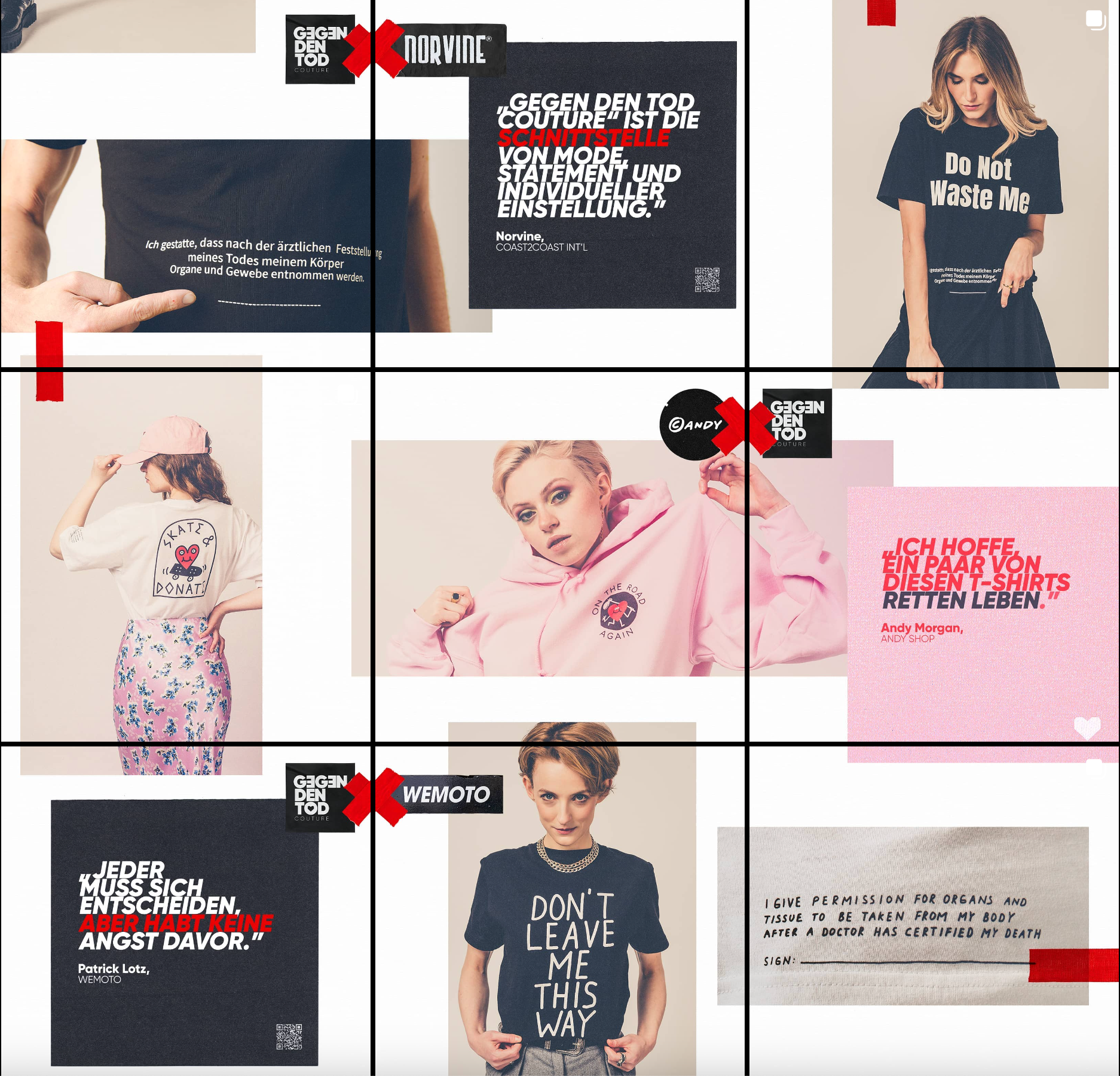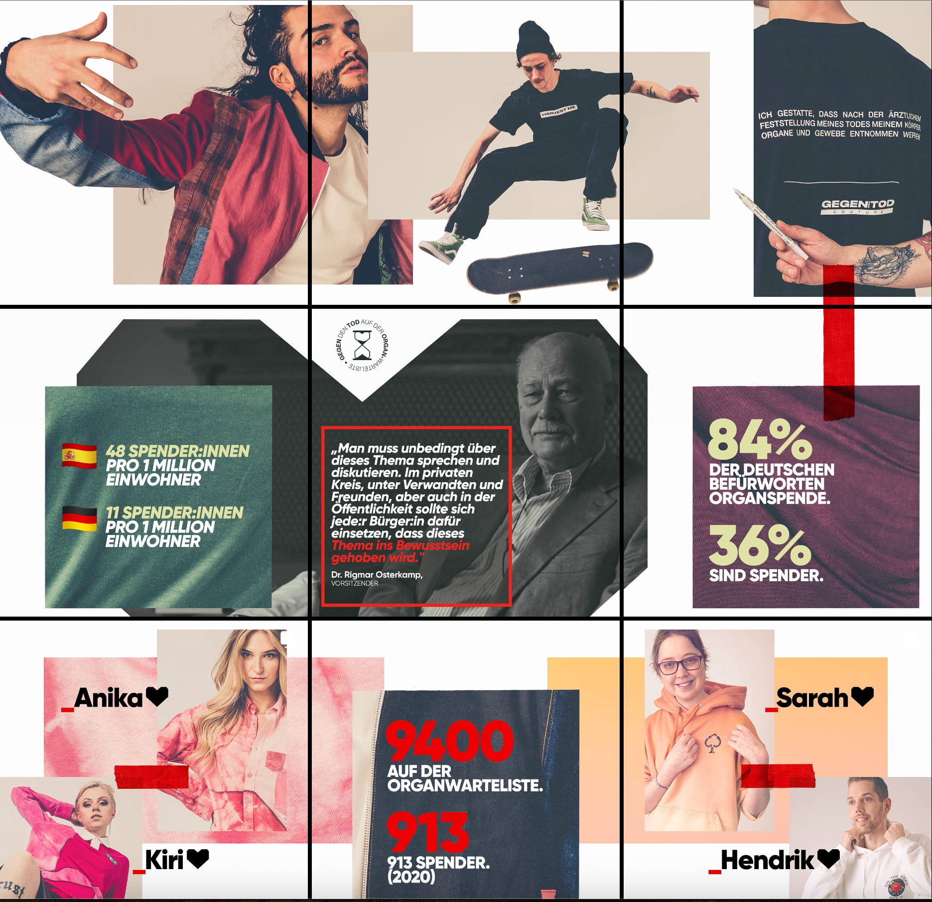 To address Germany's critical organ donor shortage, we launched the "Against Death Couture" campaign together with the NGO Gegen den Tod auf der Organ-Warteliste. This initiative transformed fashion into a platform for life-saving advocacy by creating a collection of over 70 garments, including T-shirts, hoodies, and jackets that double as official organ donor cards when signed.