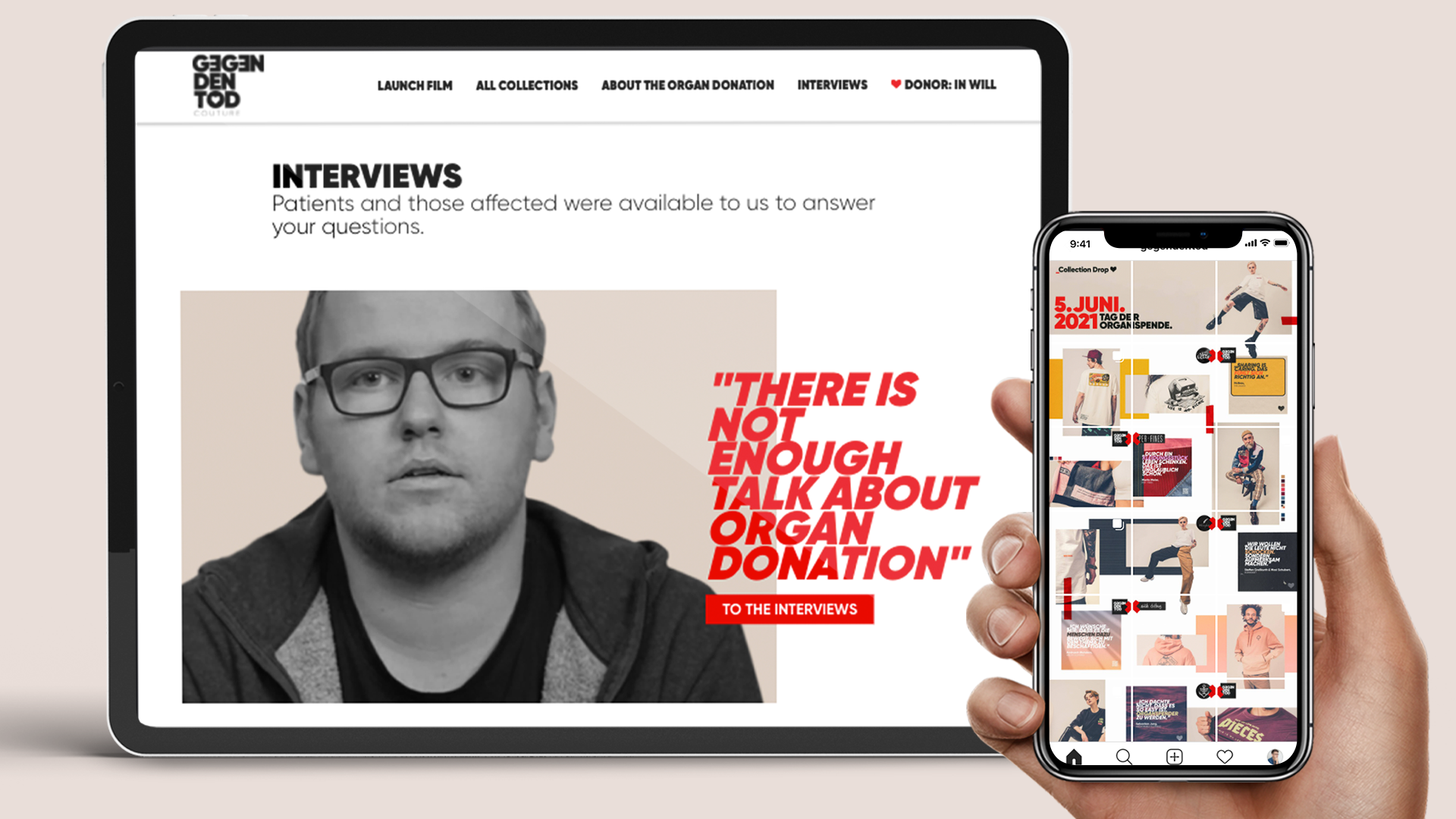 The entire collection and campaign were stitched together on a dedicated social page. Here, you could browse designs, read about the issue, and listen to the people affected by the organ shortage.